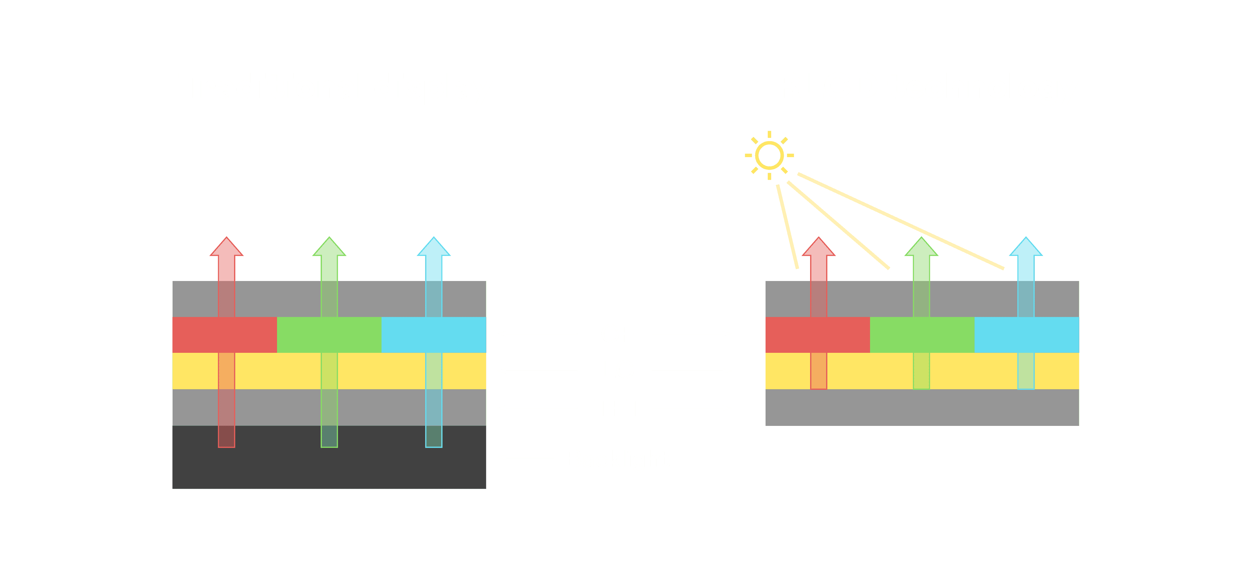 与传统需搭配背光单元的液晶显示相比,,,,反射式液晶技术不仅更省电、、、、更轻薄,,,且即便在艳阳下仍能清晰显示。。。。此外,,,少了背光单元,,,,也大幅降低了 LED 蓝光伤害眼睛的疑虑。。。